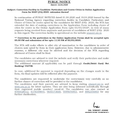 In the reference of many requests being received from aspirants and parents of candidates for correction in NEET (UG)- 2020, On dated – 14th April 2020, the NTA has extended the date of making corrections in the Application Form including choice of cities for centre in the Online Application Form NEET UG 2020 up to 3rd May 2020.