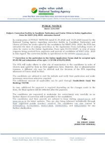 NTA extended Online NEET (UG)-2020 Application Form for Correction in Candidate Particulars and Centre Cities